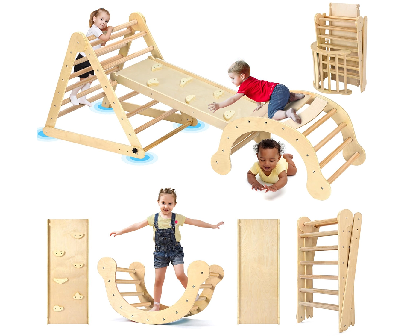 The YOLEO Large Pikler Triangle Set 7-in-1 provides a safe, adjustable climbing experience for toddlers 1+, featuring a sturdy base, quick-fold design, and versatile indoor playground fun.