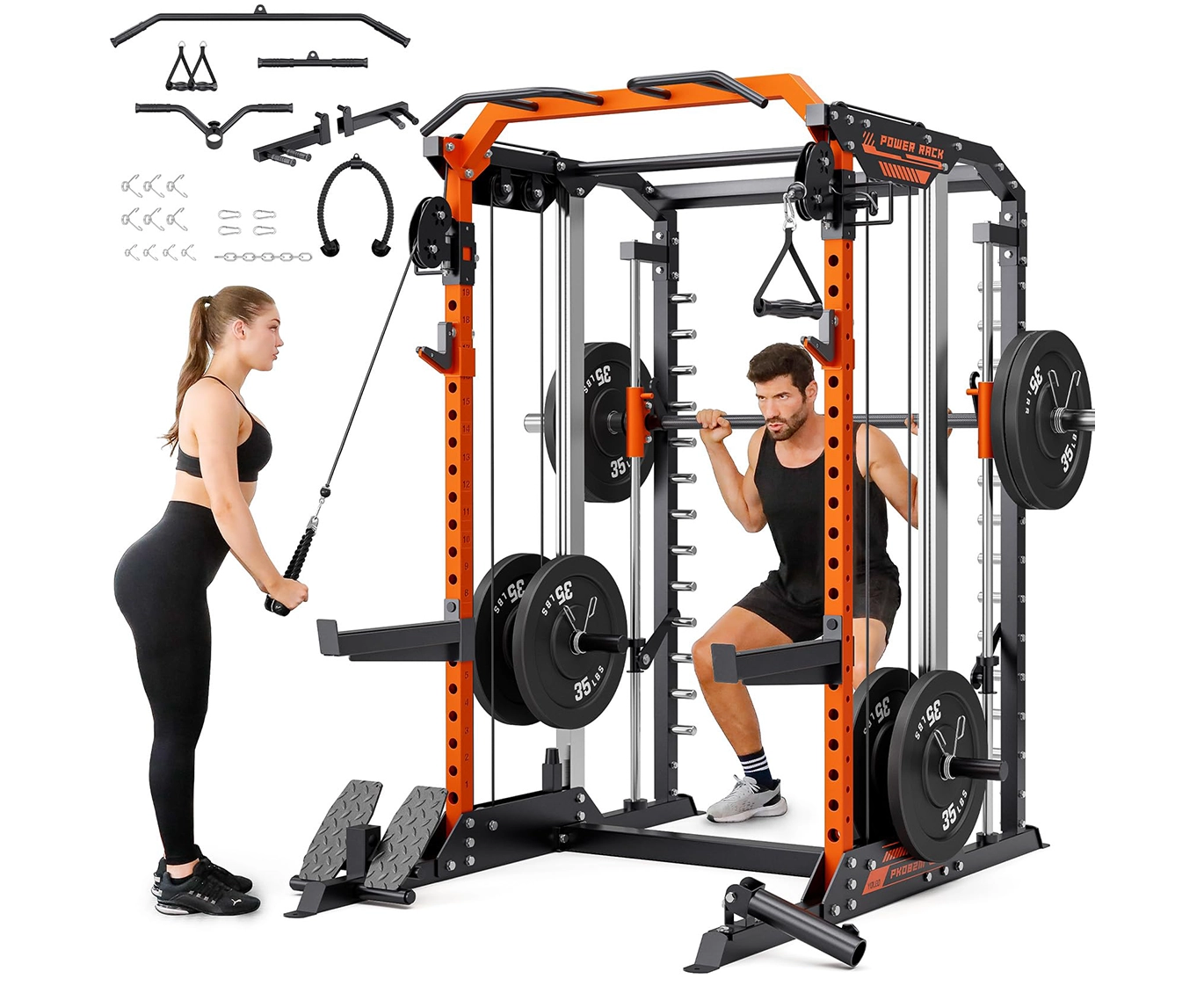The YOLEO Smith Machine features a 1700LBS adjustable dual-pulley cable system, cable crossover, squat rack, lat pulldown, and dip bar for a complete home gym workout.