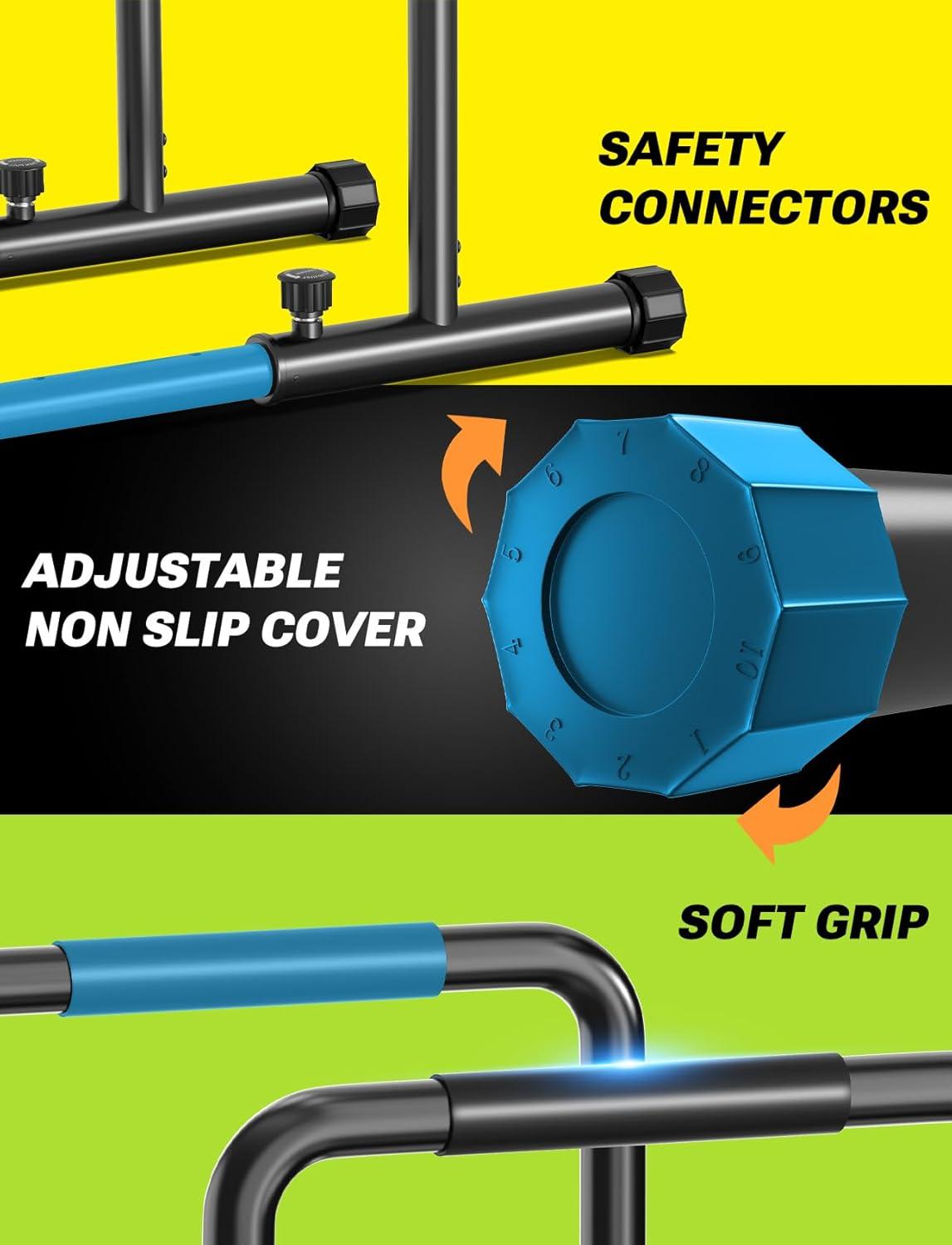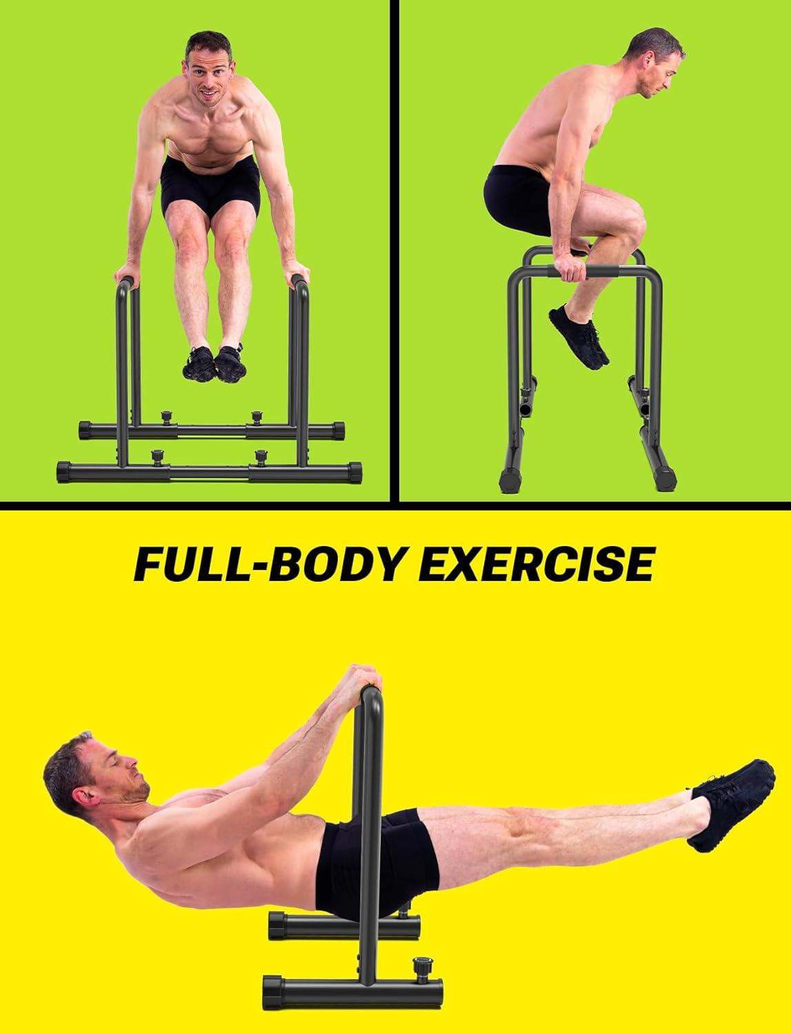 【Adjustable& Functional】 Adjustment and versatility of dual bars are the main benefits of this parallette set. The height and width are adjustable in case of several exercises that work with higher bar heights. This dip rack allows for the performance of multiple exercises from a variety of angles so the users can do dips, rows, leg-ups, or back exercises like reverse push-ups