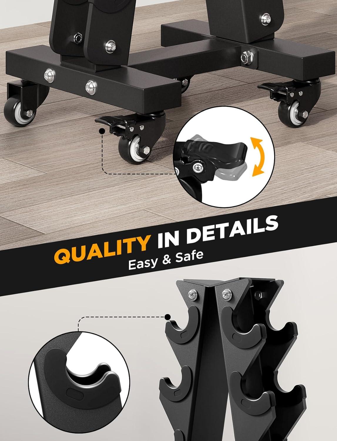 【360° SILENT WHEELS WITH LOCKING BRAKES】Upgraded PU-coated casters glide like butter on any floor (concrete, wood, tiles), while dual locking brakes prevent accidental movement. Effortlessly reposition your entire dumbbell collection in seconds – perfect for multi-functional home gyms