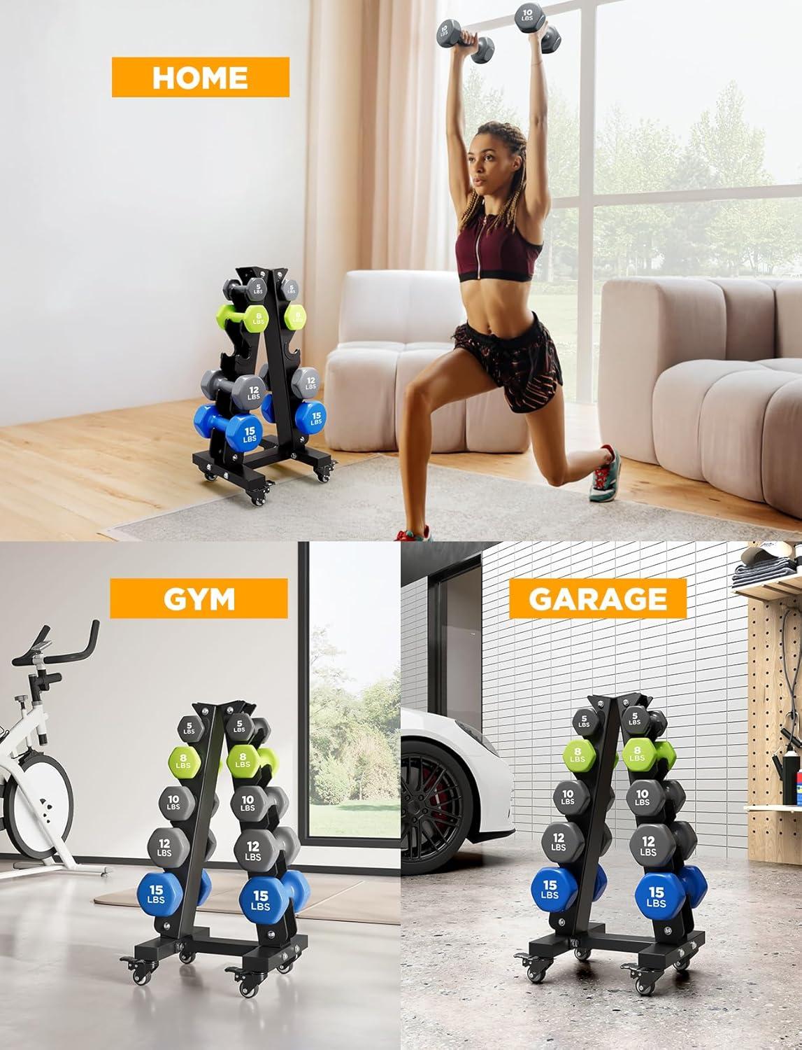 Its industrial 2mm steel frame safely stores 440LBS of weights (5 dumbbell pairs) with zero wobble, while silent 360° wheels let you glide between rooms effortlessly.