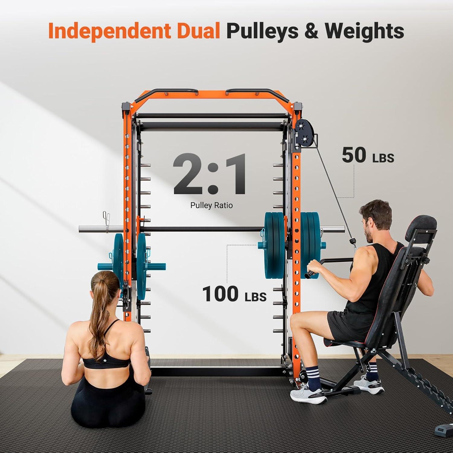 【Independent Dual-Pulley System for Multi-Target Training】Our Smith Machine home gym system revolutionizes training with dual 2:1 ratio pulley systems, featuring 4 fixed pulleys and 1 dynamic pulley per side. This engineering marvel delivers silky-smooth independent resistance for lat pulldowns, seated rows, and precision glute sculpting. The anti-shock dynamic pulley technology makes it ideal for both power cage enthusiasts and Smith Machine users seeking quiet, tension-perfect workouts.