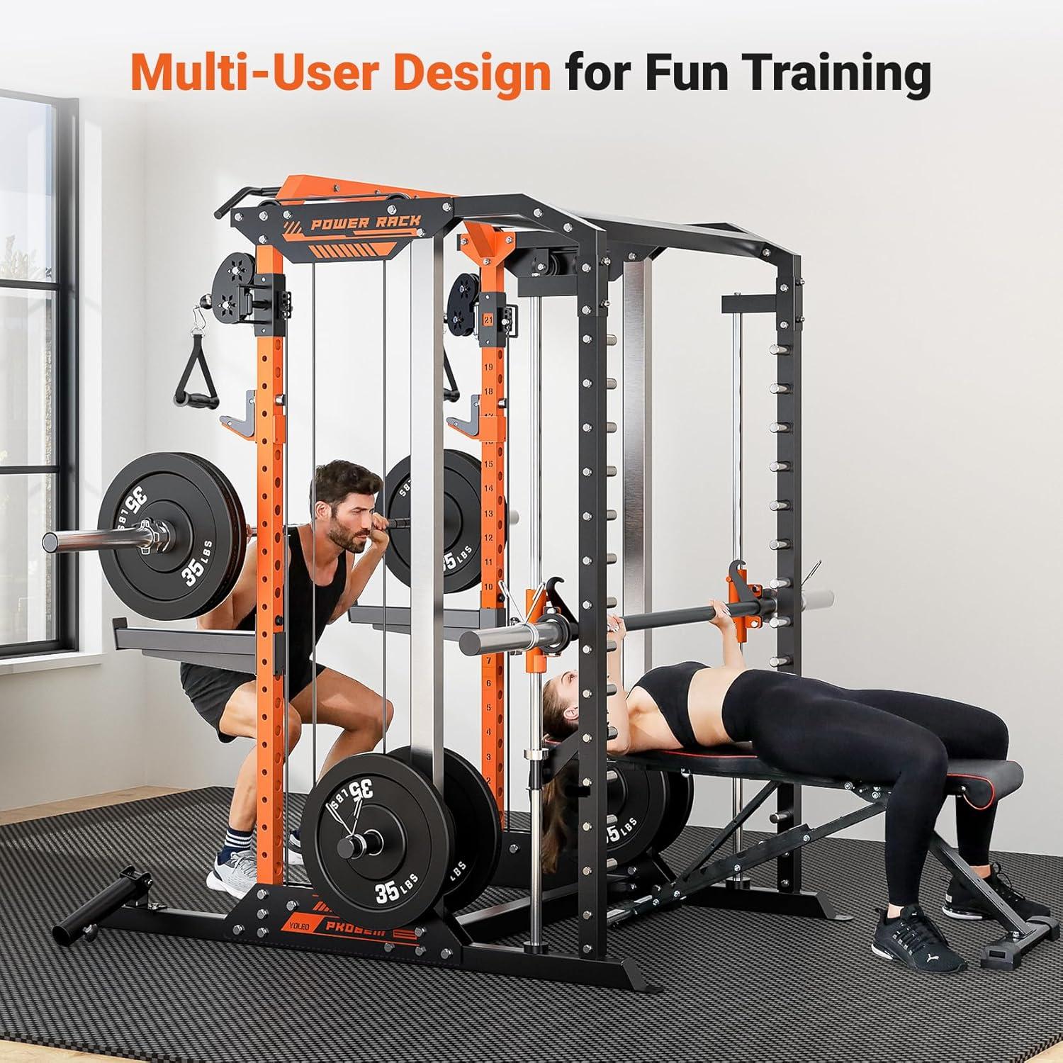 YOLEO Smooth Dual Pulley System Power Cage, 1600LBS Adjustable Cable Crossover Power Rack, Multi-Functional Squat Rack for Home Gym with More Training Attachment(Power Cage + 660LBS Weight Bench)